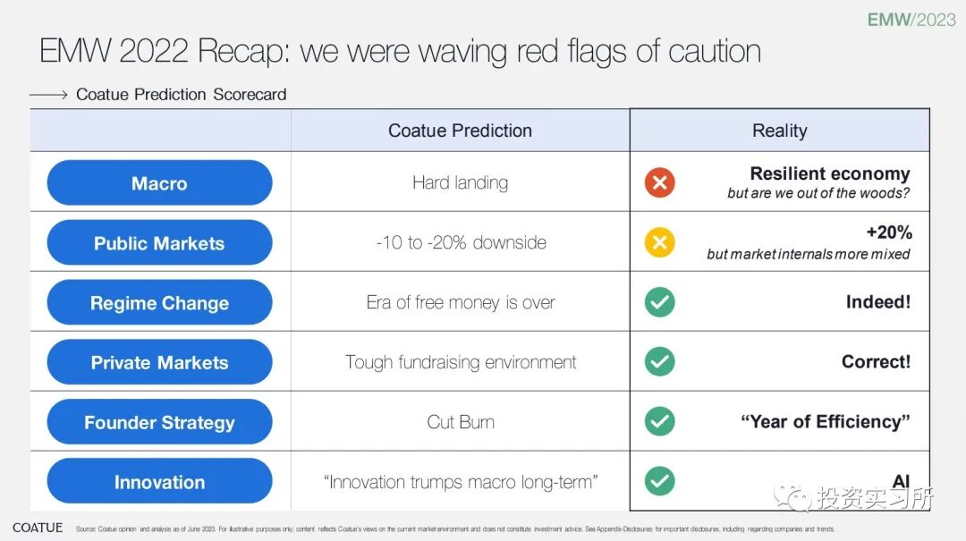 Coatue 今天分享了其 2023 年 EMW(East Meet West)大会的 PPT,主要分析了当前宏观经济情况和一二级市场的一些趋势,整个 PPT 有 46 页,我简单整理了一下,大概讲了这么几个趋势: