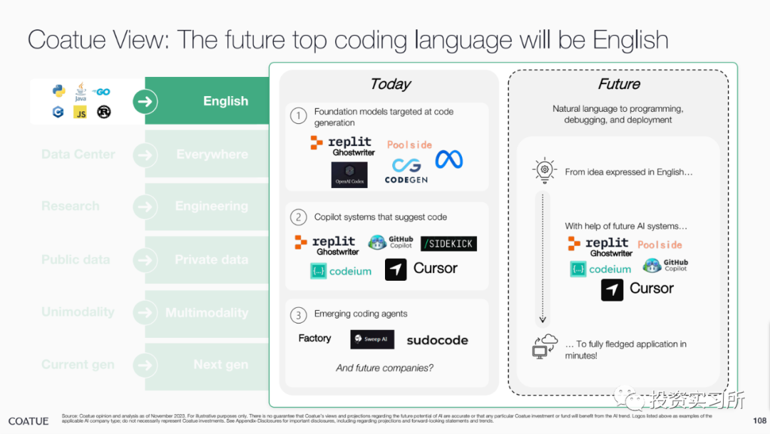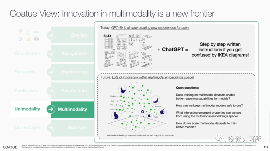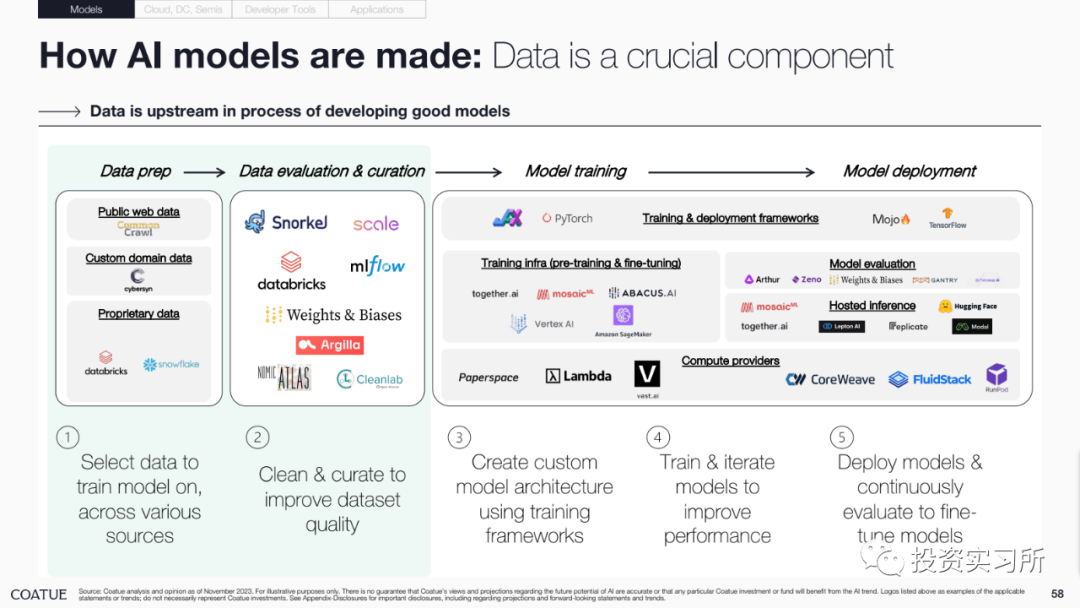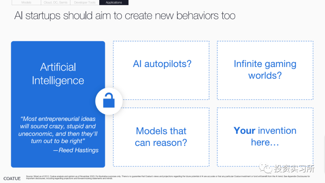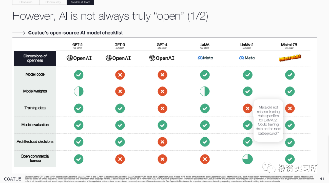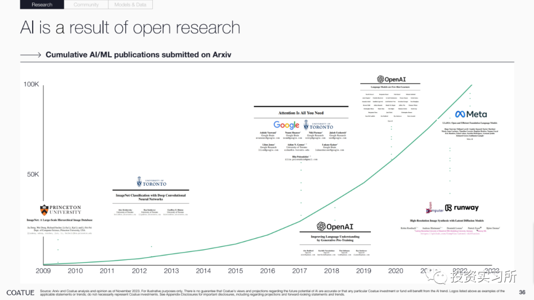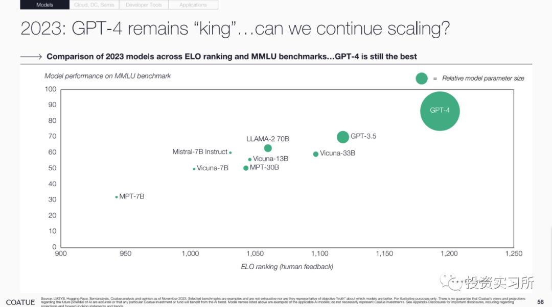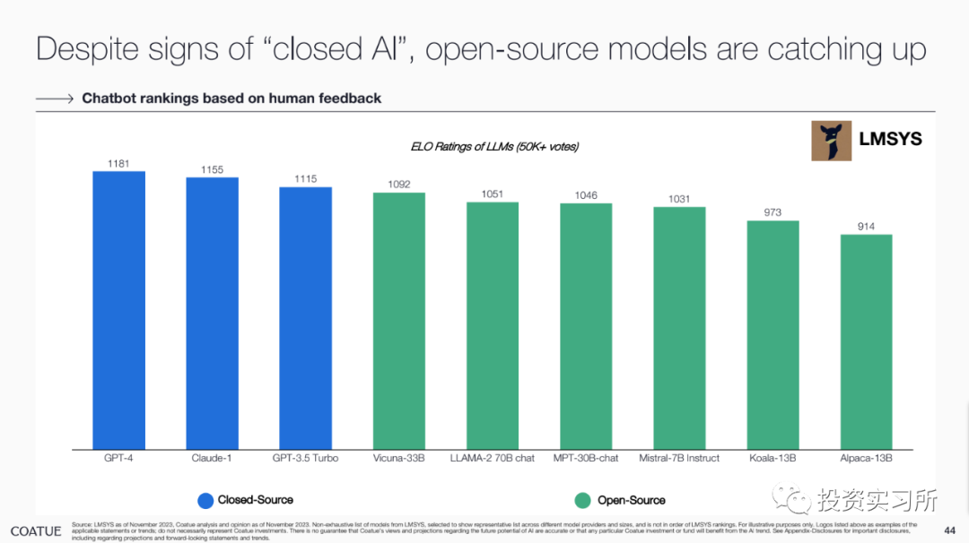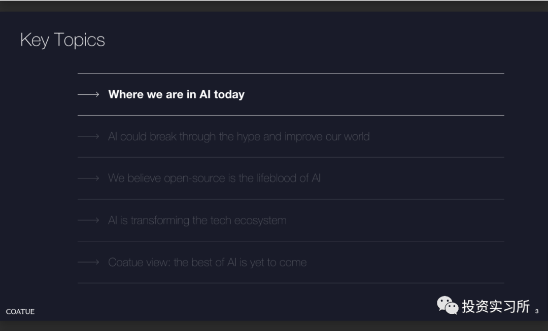 而在昨晚,投资机构 Coatue 发布了其对 AI 的研究报告,总共有 115 页 PPT,就 AI 的现状、改善我们生活的预期、AI 对一些行业的巨大影响、开源 AI 模型现状以及以 AI 为中心的技术栈机会等做了分享,认为最好的 AI 人工智能还没有到来。并且 Coatue 有一页 PPT 说,哪个 AI 大模型公司最终能取得胜利,目前尚无定论,就 OpenAI 今天发生的这些事情,好像 Coatue 预测到了啥似的。言归正传看报告。