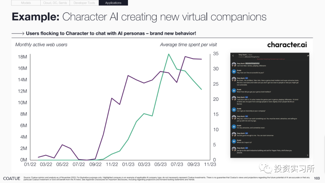 19.比方说 Character AI 正在创建一个新的虚拟伴侣,不得不说 Character AI 真的是一个很有意思的产品,任何关于 AI 的报告里都不可能不提到它,我在很早关注它时就非常看好它,但当时只是一种体验产品后的直觉(感受到其提供的情绪价值);