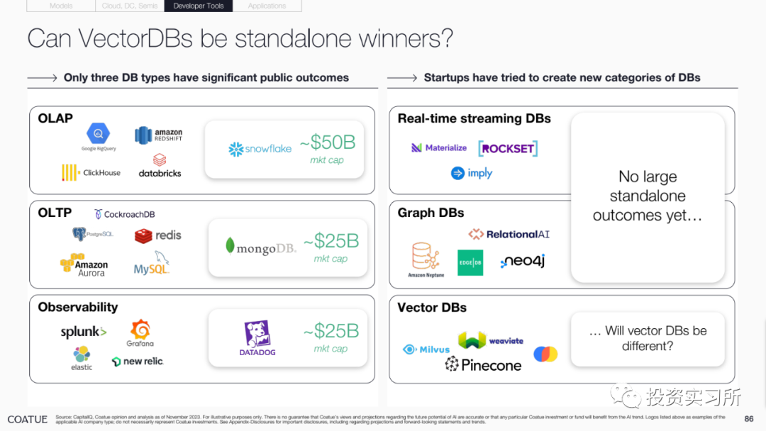 16.AI 将建立一个全新的工具生态,其实这一部分我建议大家把 PPT 里每页都看一下,Coatue 在这里还特地提到了向量数据库,最近 ChatGPT 发布新功能后市场上有不少声音认为向量数据库好像也被取代了,大家对这块目前是有些争议的,不过 Coatue 在这里讨论的是向量数据库是否会成为单独的赢家