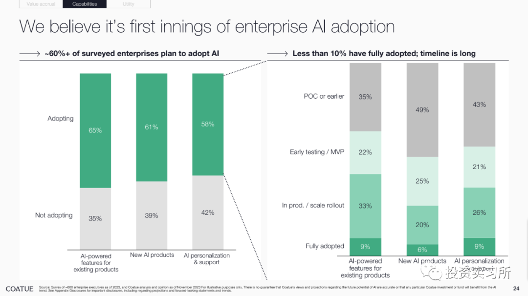 6.企业采用人工智能还处于初期阶段,我之前分享过著名投资人 Elad Gil(那个单只基金募集了 10 亿美金的 Solo VC) 关于当下 AI 4 波浪潮的一个判断,跟这个观点比较类似