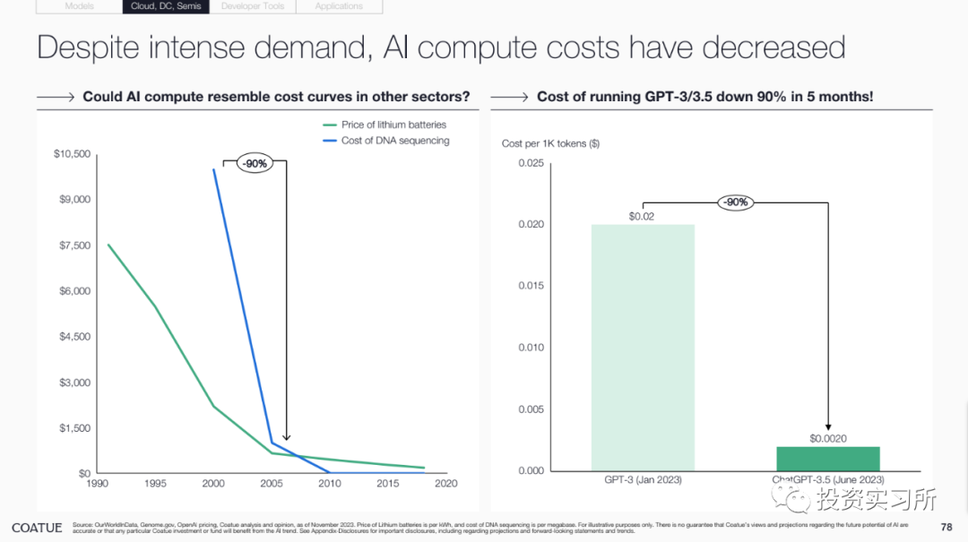 15.AI 对于 GPU 的需求才刚刚开始(是否意味着英伟达还会涨?),将对整个经济的基础设施带来巨大影响,但计算的成本已经下降了