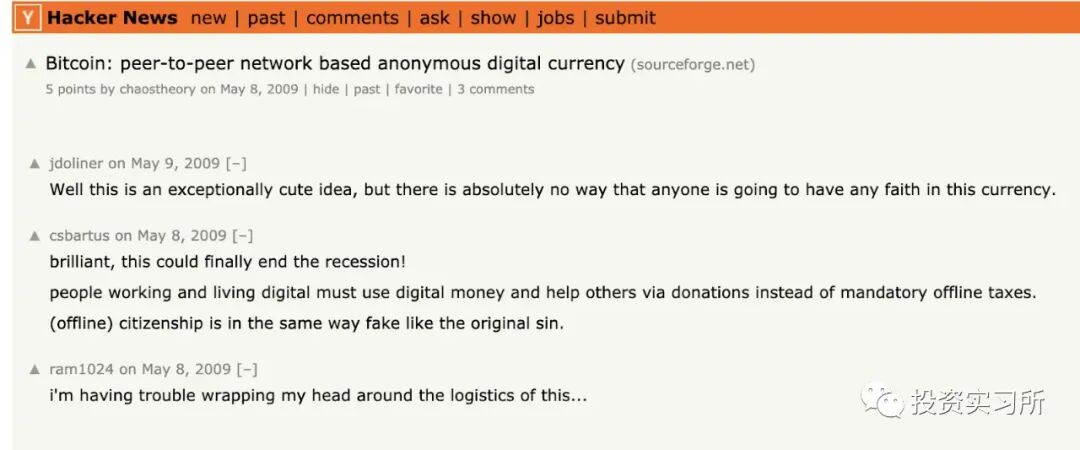 在 2012 年那个时候,大家对比特币的认知还非常的早期,相信比特币的人非常非常少(现在也不算多),Garry Tan 最早看到比特币的新闻,是在 Hack News 上,这个社区最早提到比特币是在 2009 年,下面的评论可以看出当时大家对比特币的看法。