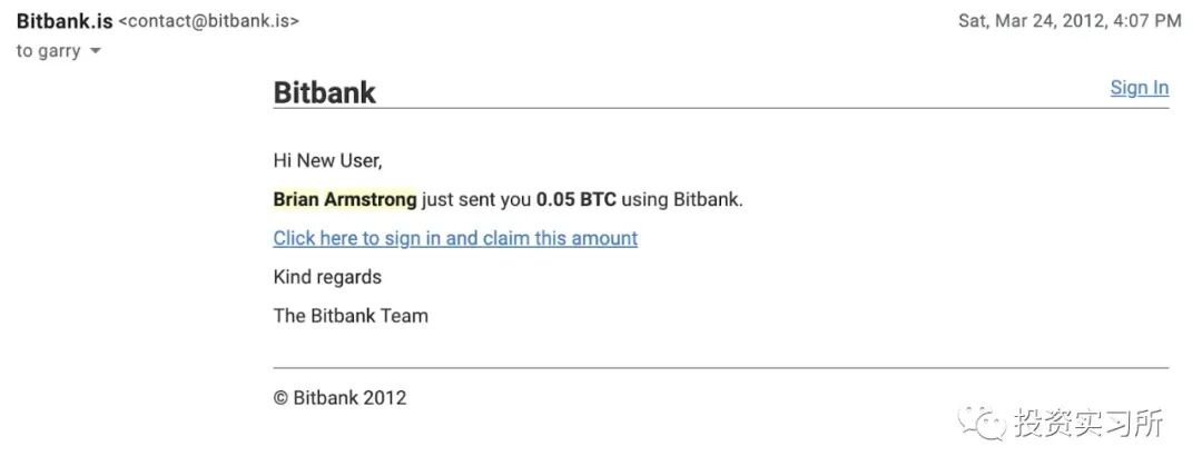 2012 年 3 月,Brian Armstrong 用他新创的公司 BitBank(后改名为 Coinbase)给他发送了 0.05 个比特币,当时 Brian 对这个产品的想法很简单,就是为人们创建一个非常简单的产品来购买和持有比特币。
