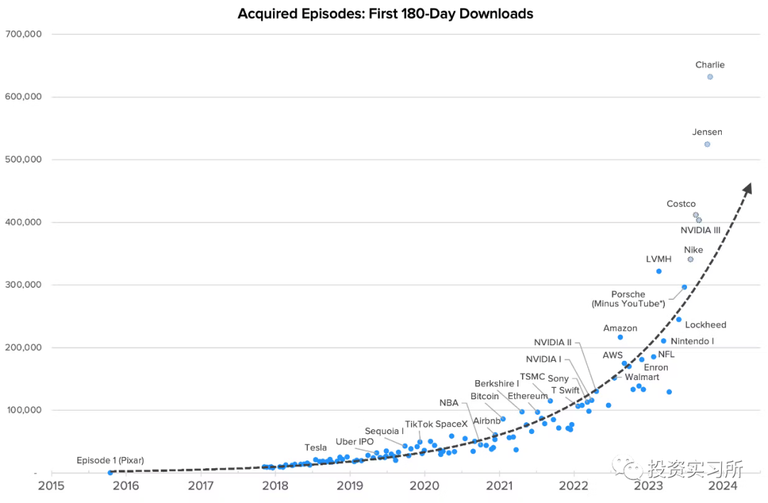 这种非常耗费时间的深度研究,导致 Acquired 播客内容的生产速度很慢,一个月一般也就 1-2 期的内容,虽然并非每一期都会耗费像 Nike 那么长时间,但平均下来每一期内容至少也要 100 多个小时,因此今年截至现在其播客的内容总共为 18 期。