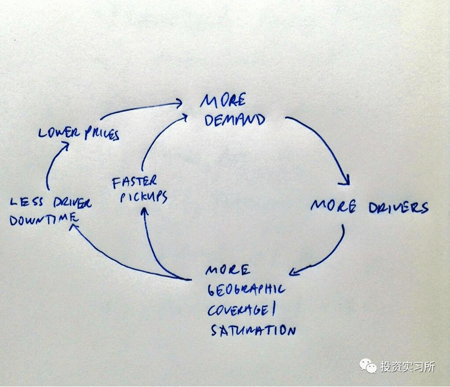 他继续列举了其它因素,比如更快的上车时间、无缝支付和更好服务等因素,作为增加流动性的驱动力,并将 Uber 的飞轮推向了新的机遇。
