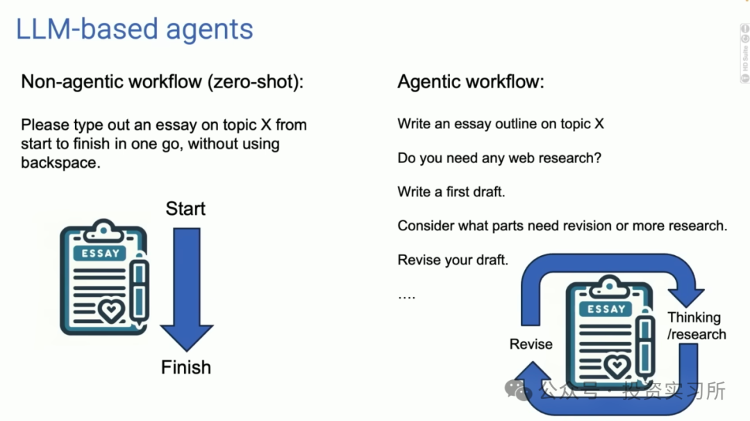 相比之下,Agent 式工作流是这样的:让 AI 编写文章大纲,看是否需要做一些研究,然后写初稿,阅读初稿并思考哪些部分需要修改,然后修改草稿,如此反复。这个工作流程更加迭代,在其中你可能让语言模型做一些思考,然后修改文章,然后做更多的思考,如此迭代多次。