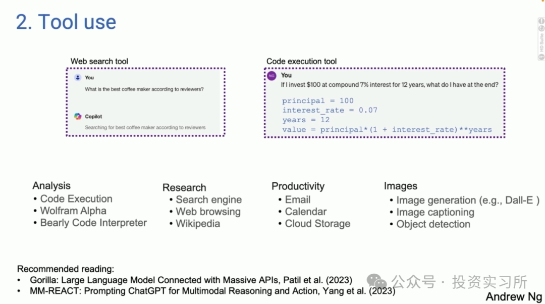 对于一些问题,它会生成代码并运行代码。事实证明,有很多不同的工具被用于分析、收集信息、采取行动和提高个人生产力。
