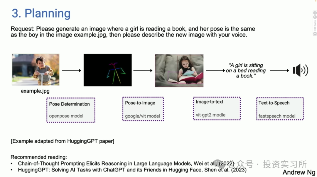 给出这样一个例子,今天我们有 AI Agent 可以做,首先要确定男孩的姿势,然后可能在 Hugging Face 上找到合适的模型来提取姿势。接下来需要找到一个姿势图像模型来合成一张女孩的图片,遵循指令,然后使用图像到文本的转换,最后使用文本到语音的转换。