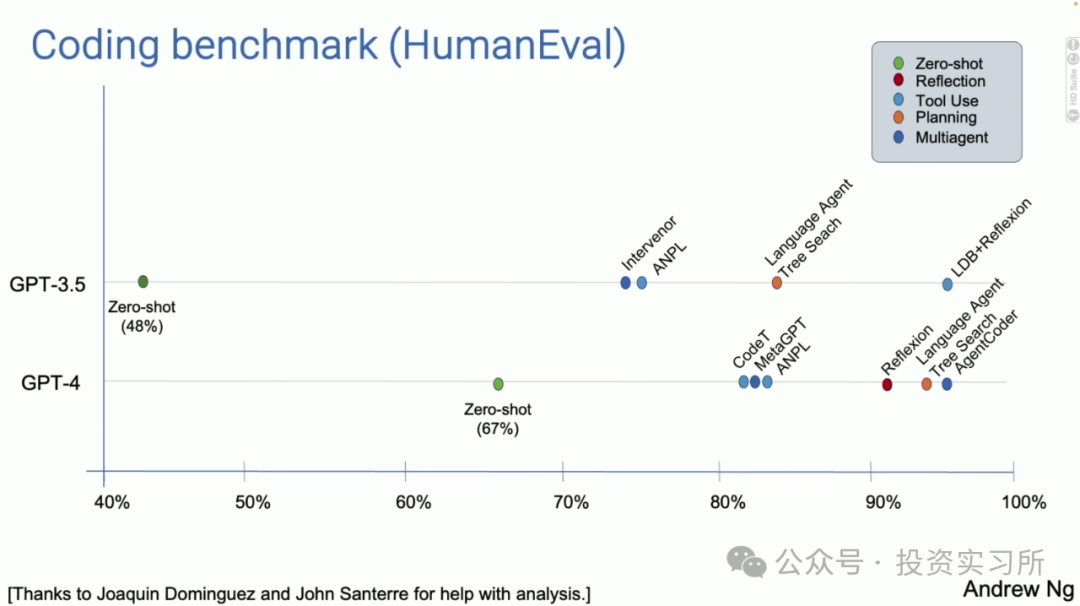 如果你使用 GPT-3.5 进行 zero-shot 提示,正确率为 48%,GPT-4 则达到了 67%。但如果你基于 GPT-3.5 使用 Agent 式工作流,实际上会比 GPT-4 做得更好。如果你在 GPT-4 使用这种类型的工作流,效果也会非常好。你会注意到,使用 Agent 工作流的 GPT-3.5 实际上优于 GPT-4,我认为这对我们如何构建应用程序有重大影响。