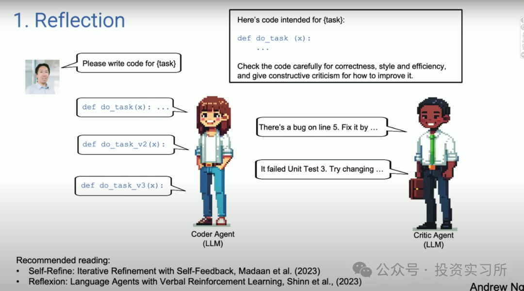 1.关于反思(Reflection),举个例子,假设你要求系统为你编写一个给定任务的代码。然后我们有一个 Coder Agent,它本质上就是一个语言模型,你提示它编写类似 def do_task() 这样的函数。