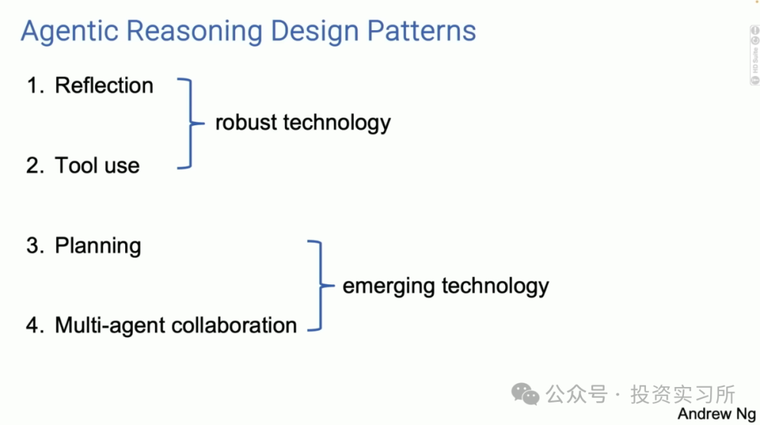 反思(Reflection) 是一个我认为我们都应该使用的工具,因为它确实有效,但我认为它还没有得到广泛的认可。规划(Planning)和多智能体协同(Multi-agent collaboration) 目前还处于新兴阶段,当我使用它们时,有时会对它们的表现感到震惊,但至少在目前,我觉得还不能让它们稳定工作。