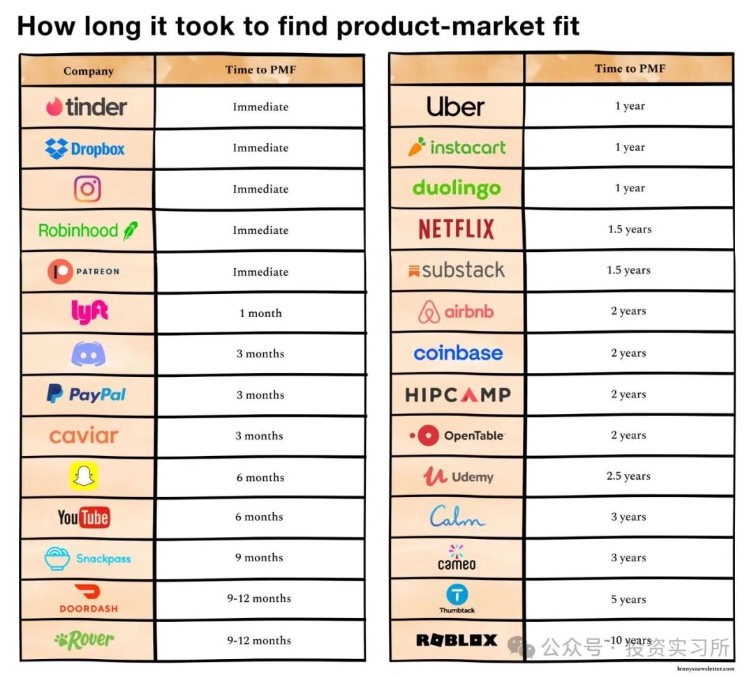 Lenny 之前总结过一些创业公司找到 PMF 的时间,既有像 tinder、Dropbox 以及 Instagram 这种马上就实现 PMF 的,也有像 Airbnb、Coinbase 以及 Calm 这种花了 2-3 年时间的,而 Roblox 更是花了 10 年时间。