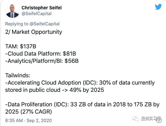 市场规模方面,TAM 的规模为 1370 亿,而且还在不断增长--数据云的规模为 810 亿,加上分析平台的规模为 560 亿。随着数据的持续增长,以及新的分析时代被越来越多的人所接受,行业趋势认为未来几年这一数字将大幅上升。