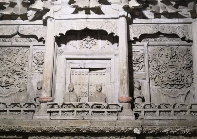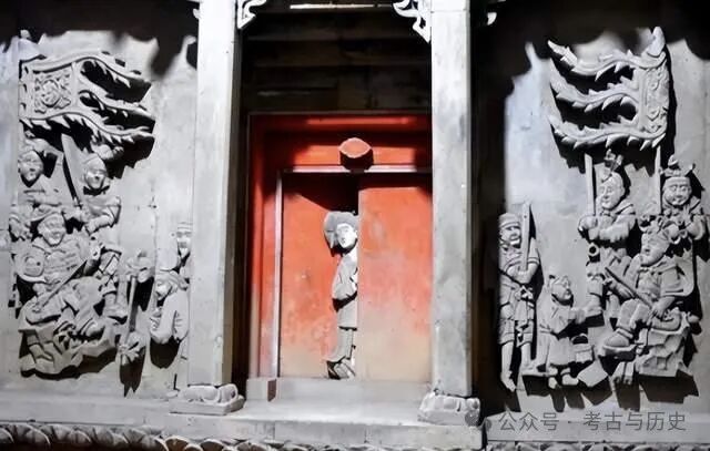 那个进入墓室的年轻人看到的“女鬼”就是著名的“妇人启门”砖雕。一扇朱红色大门微启,一位妇人探出半身向外张望,似乎是在等待亲人归来,又似是在偷看前方戏台上的表演;还有一种说法是寓意为“一门贵富(倚门贵妇)”。