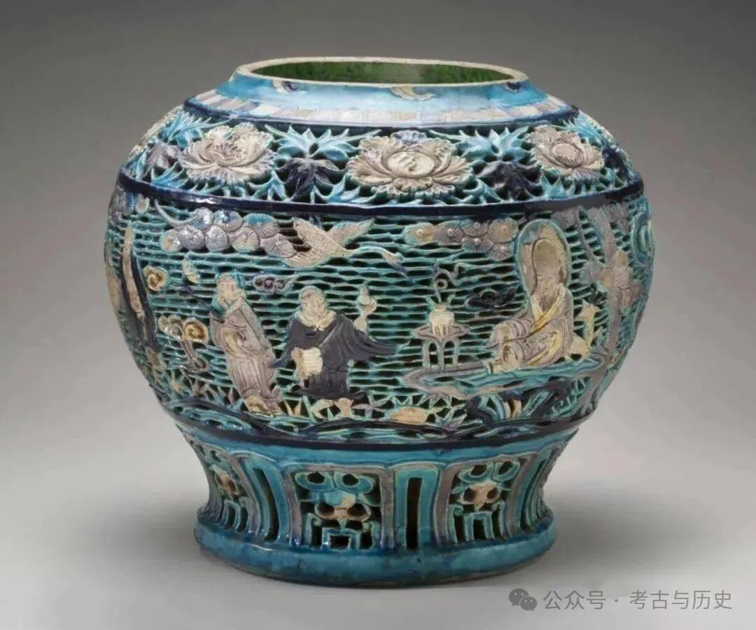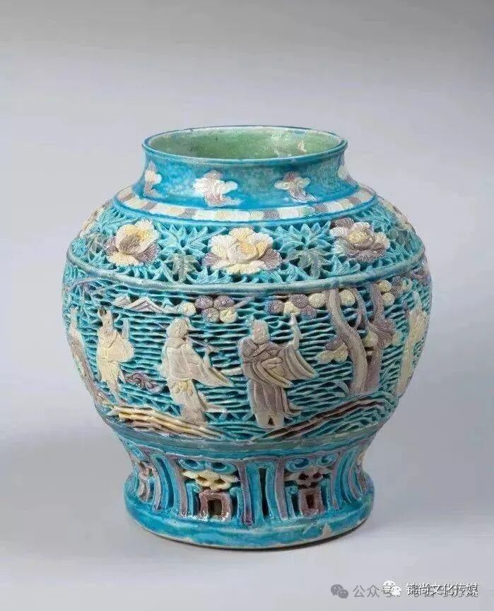 珐华釉是陶、瓷器装饰的一种低温色釉,也称为“法花”、“法华”、“珐花”。它的烧制技术源于琉璃,并发展成为与琉璃制品不同的新品种。珐华釉使用牙硝作为熔剂,施釉方法是在网胎表面采用立粉技术,勾勒出凸线或堆贴纹饰轮廓,然后分别以所需彩料填底子和花纹色彩,入窑烧成。