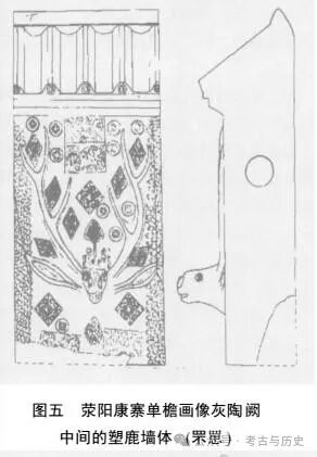 文中指出:荥阳康寨和济源市邵原镇有出土此类鹿的形象, 有首无身, 两角向上呈弧形至顶檐, 双眼圆睁, 其中一鹿的脑门上还插一柏; 一般在双阙中间的罘罳屏墙上。鹿头周围, 还模印有许多柏的图形。而柏 (长青树) 在汉墓的画像中是非常多的, 这主要和汉代人认为柏能驱鬼辟邪有关。