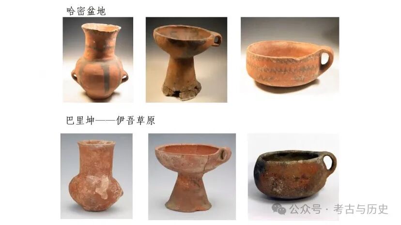 我认为,在史前文化研究上,考古学的尽量归考古学,历史文献学的归历史文献学,人类学的归人类学等等,各学科严格基于各自的研究范式得出有限的结论,这样的结论应该都是可靠的、正确的。之所以存在打架的现象,是因为我们过度进行联系或者错误地解释模型。考古学文化是一般是基于对器物(一般是陶器)演变的观察划分出来的,并不能和族群严格对应,尤其是在研究王室贵族来源的时候更是如此。使用同一类型器物的不见得是同一群人,使用不同器物的也可能有相同祖先。王建新老师的讲座演讲《欧亚草原游牧经济与游牧文化的形成与演变》一文中对天山南北游牧和农业两种生业类型人群使用的陶器进行了对比研究,发现这两个地域之间的交流十分频繁,天山以北的巴里坤-伊吾草原与天山以南的哈密盆地出土的陶器形制几乎一致(见下图)。说明陶器器形、产地一致,不代表使用者必然是同一群人。虽然这是对两个不同生业类型人群的对比,和同为农业人群的情况有所不同,但也能给我们一点启示。