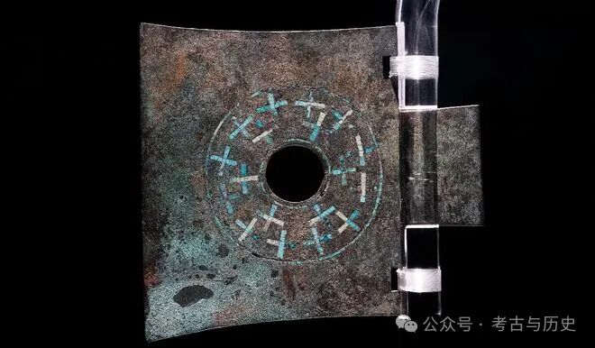 不过,也有专家认为,目前二里头出土的青铜器,未必能代表二里头文化青铜制造的最高水平。比如下面这件青铜钺,虽然非正式考古发掘出土,但考古学家根据二里头遗址出土的镶嵌十字纹铜圆形器推断,十字纹方钺也应当是夏代晚期的遗物。