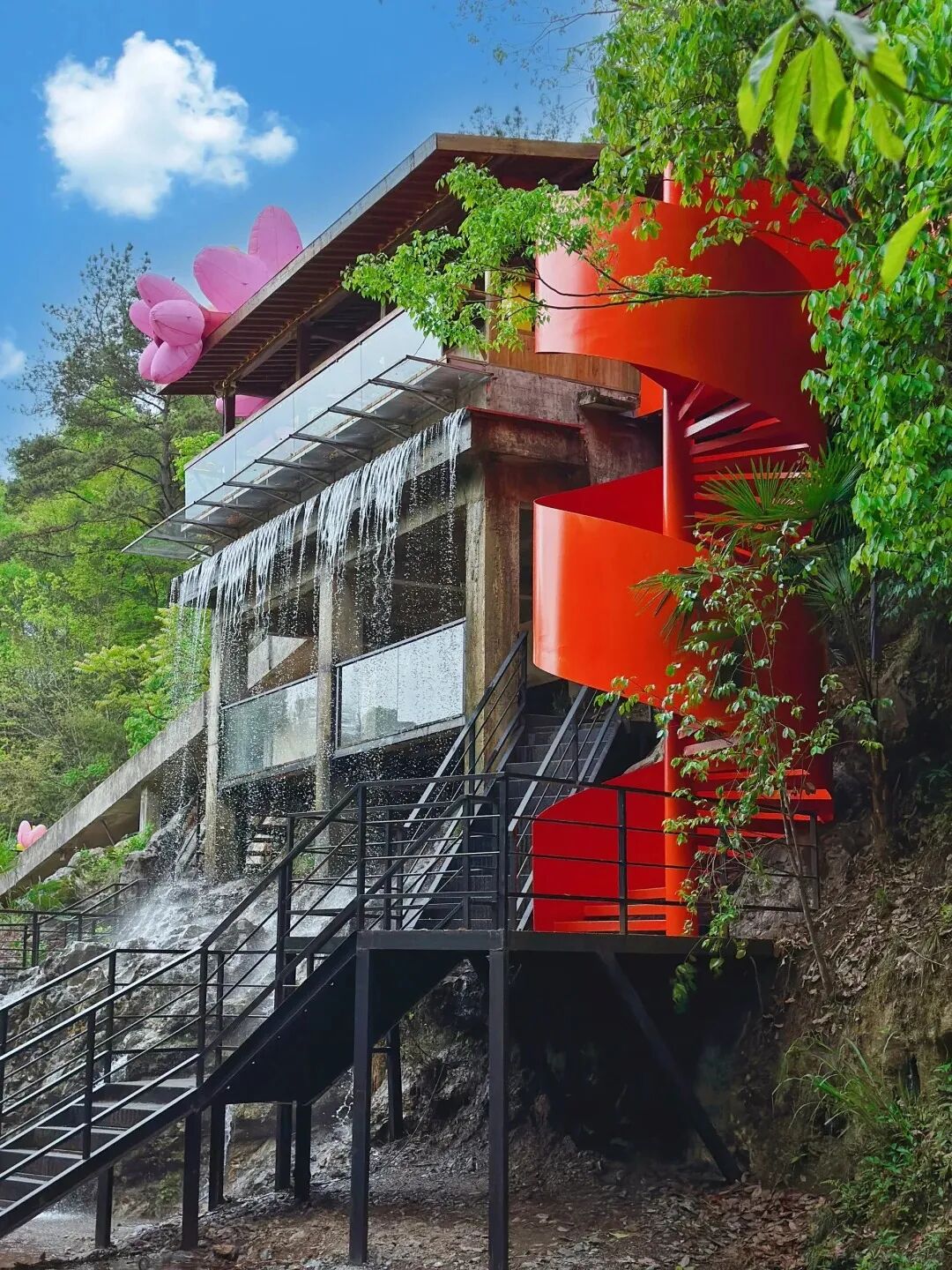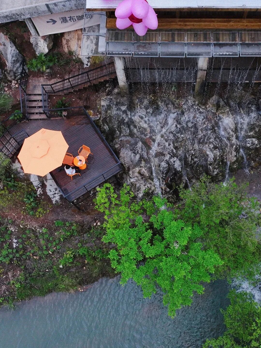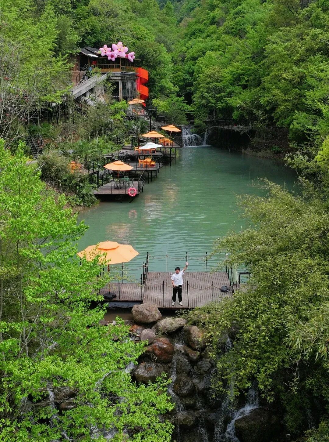 杭州也有自己的瀑布咖啡啦瀑布倾泻下来,汇聚在下面相当大的一片湖里这里就是:📍桐庐·琴溪香谷