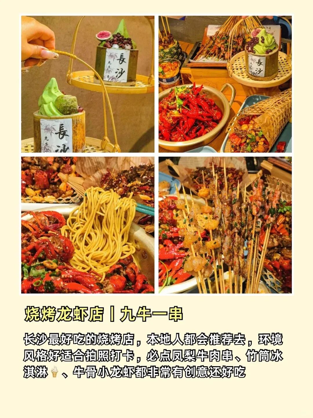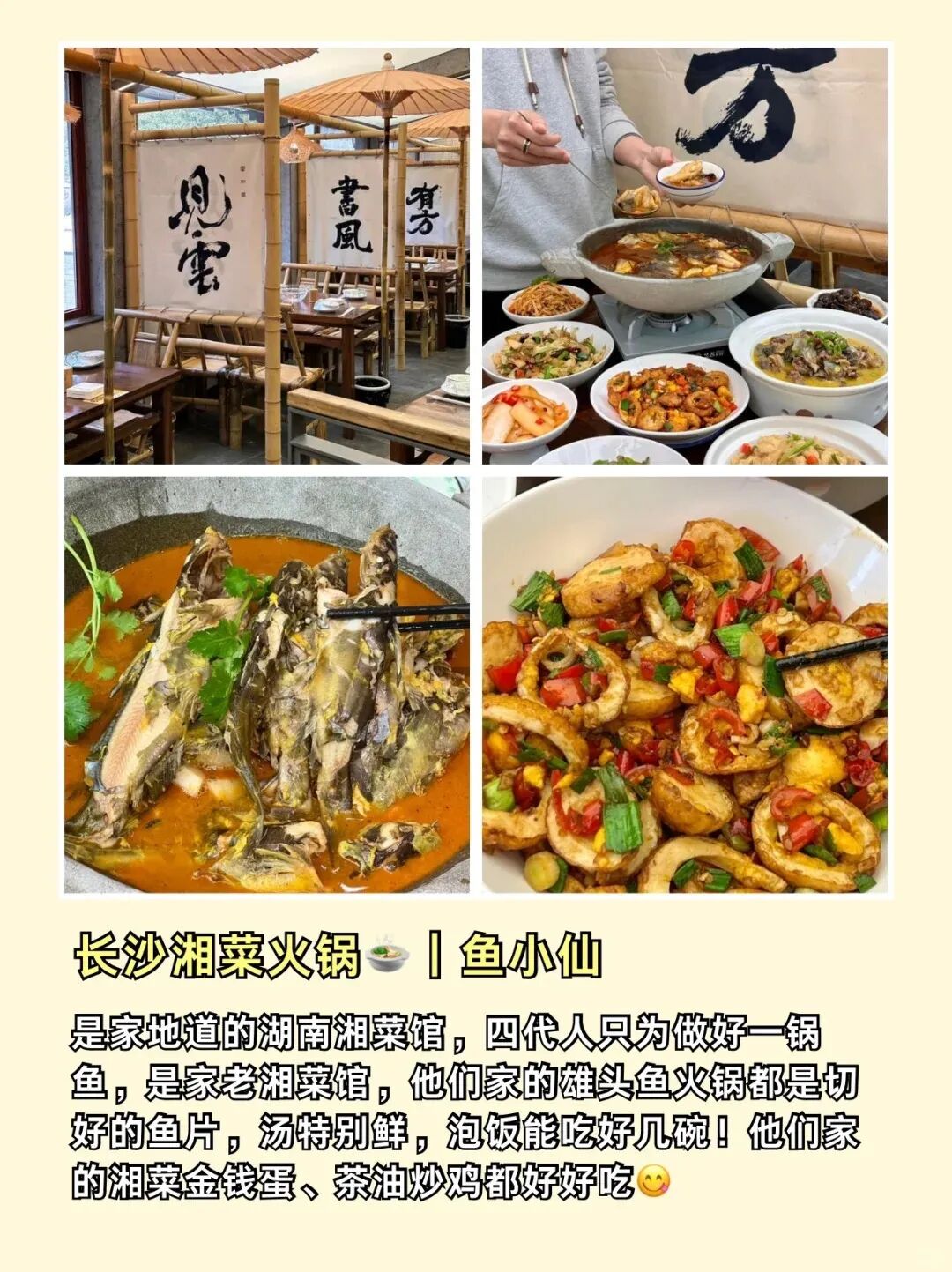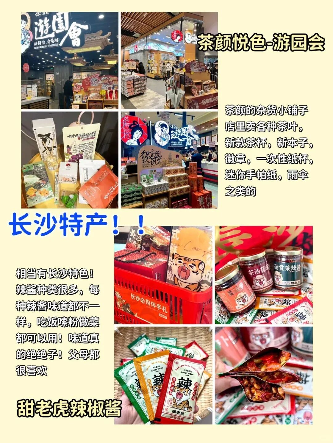 📍长沙湘菜火锅|鱼小仙✅是家地道的湖南湘菜馆,四代人只为做好一锅鱼,是家老湘菜馆,他们家的雄头鱼火锅都是切好的鱼片,汤特别鲜,泡饭能吃好几碗!他们家的湘菜金钱蛋、茶油炒鸡都好好吃📍烧烤龙虾店|九牛一串✅长沙最好吃的烧烤店,本地人都会推荐去,环境风格好适合拍照打卡,必点凤梨牛肉串、竹筒冰淇淋、牛骨小龙虾都非常有创意还好吃📍蟹主隆恩.虾蟹馆✅长沙土著常去吃的地道口味小龙虾蟹馆🦞重口味的姐妹必冲呀!推荐山胡椒小龙虾、油焖肉蟹、椒麻罗氏虾、酱爆墨鱼仔-【长沙特产】📍茶颜悦色-游园会✅店里卖各种茶叶,新款茶杯,新本子,徽章,一次性纸杯,迷你手帕纸,雨伞之类的📍甜老虎辣椒酱✅相当有长沙特色!辣酱种类很多,每种辣酱味道都不一样,吃饭嗦粉做菜都可以用!味道真的绝绝子!