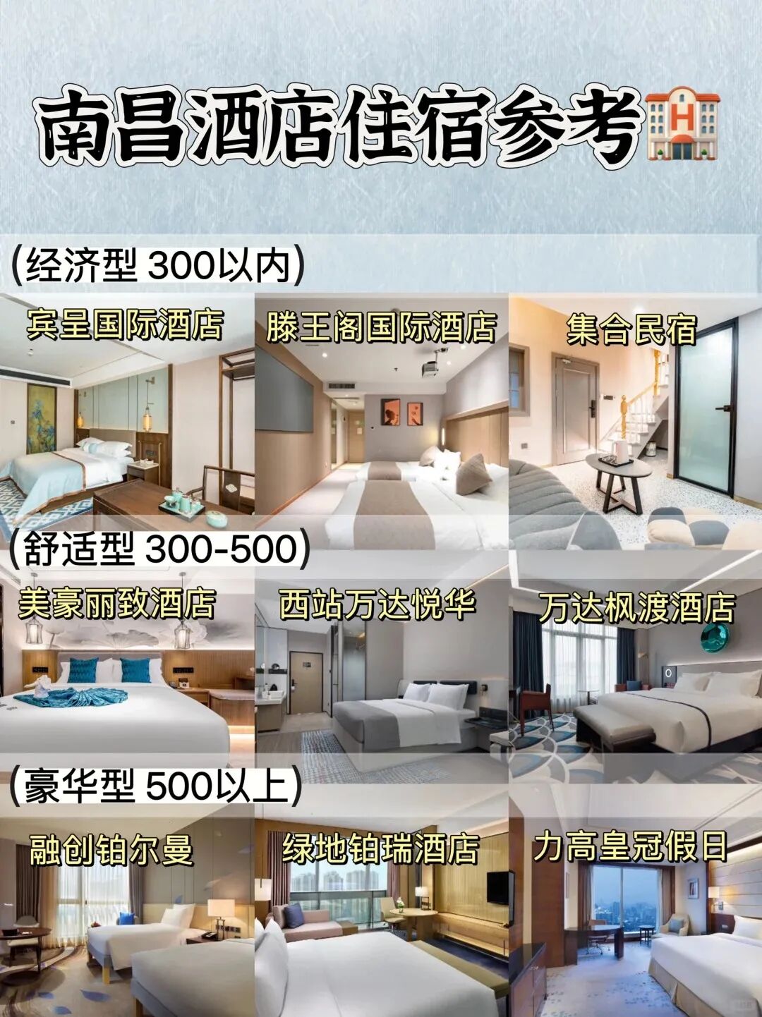 建议住在八一广场,秋水广场,红谷滩附近,吃饭交通都比较方便,根据不同档位价格给大家整理了几家酒店参考