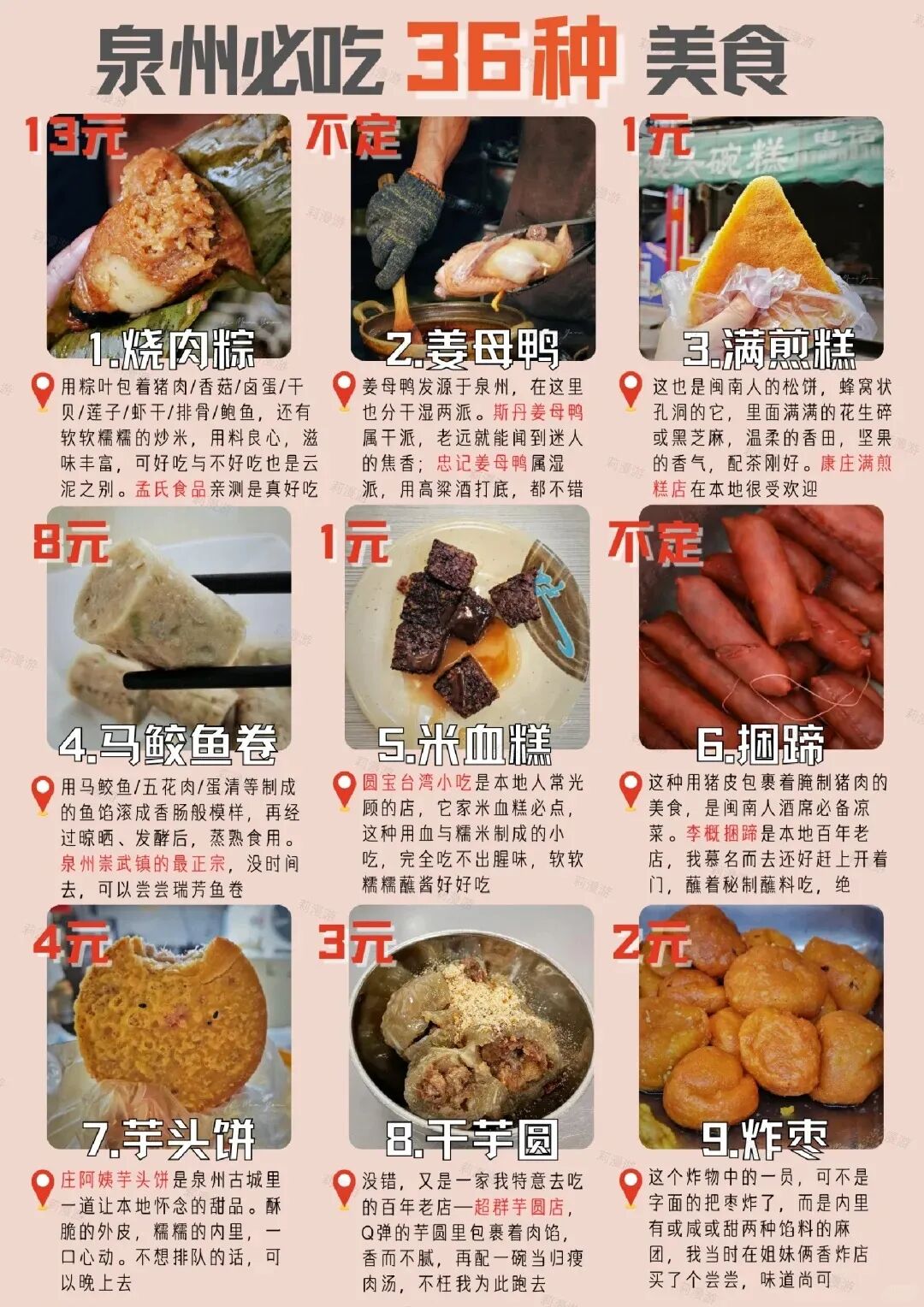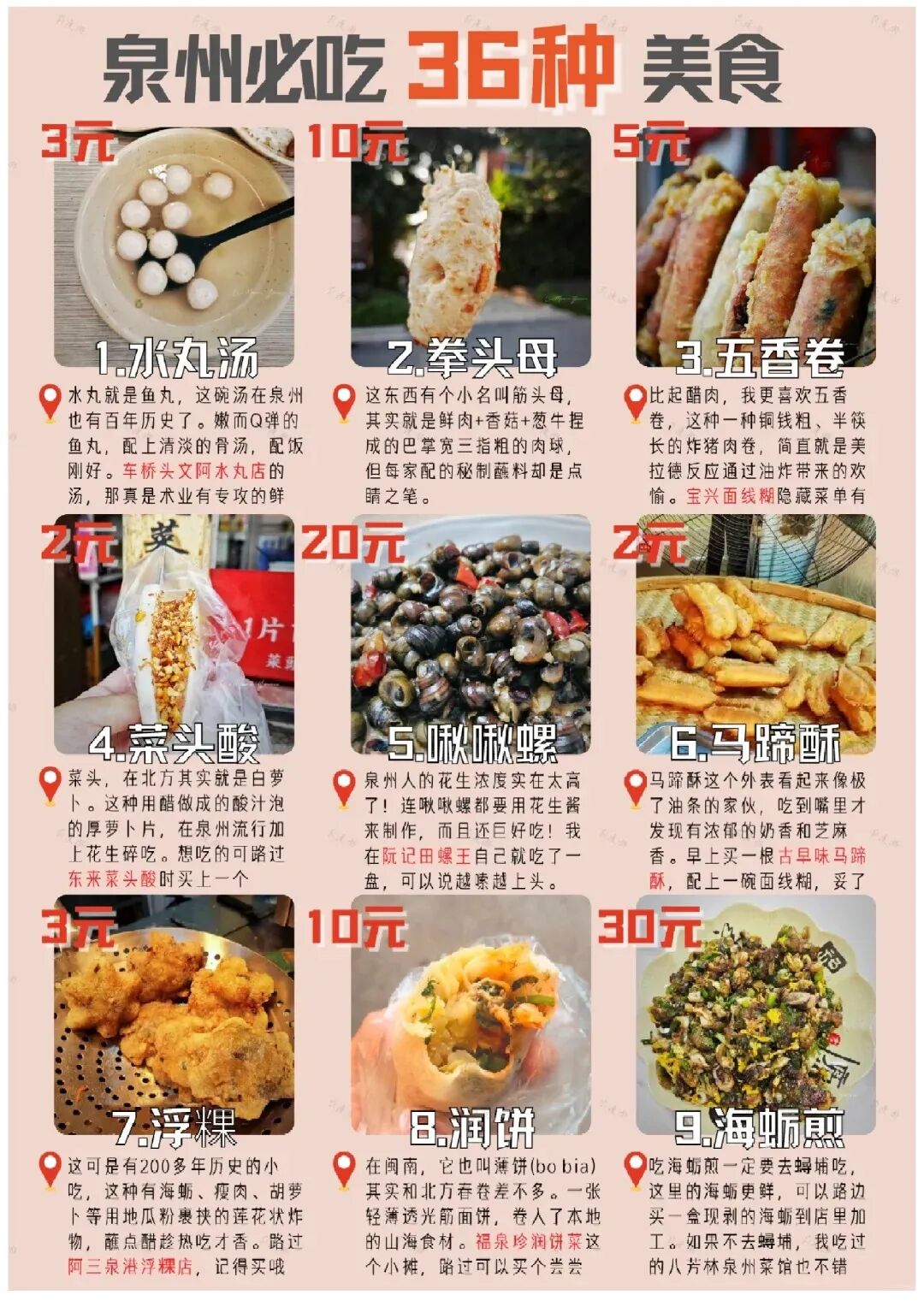 🥜鲤城区古城内📍八芳林·泉州菜馆📍阮记田螺王📍泮宫蚵仔煎📍水门啊琴姐石花膏📍东来菜头酸📍庄阿姨芋头饼📍康庄满煎糕店📍海丝金凤正宗元宵圆📍秉正堂石花膏(天后宫总店)📍永春豆仁咯摊新门店📍孟氏食品老店(丽玲麻花店)📍阿玲花生汤📍斯丹姜母鸭(涂门街分店)📍忠记盐烧番鸭📍水门国仔老店(水门巷店)📍万记肉粽店📍尚阿牛肉店📍福泉珍润饼菜📍阿三泉港浮粿📍古早味马蹄酥(中山南路店)📍福鼎笨小吃(涂门街店)📍小安记古早味手工麻糍📍车桥头文阿水丸📍贻庆食品(新华店)📍姐妹俩香炸店