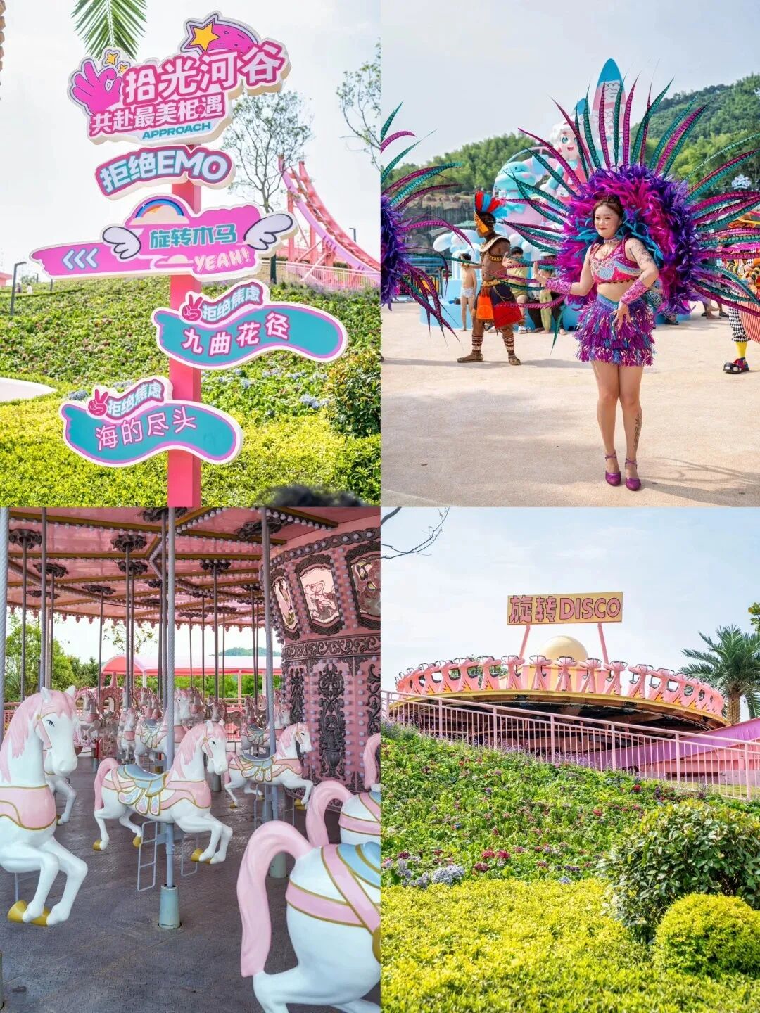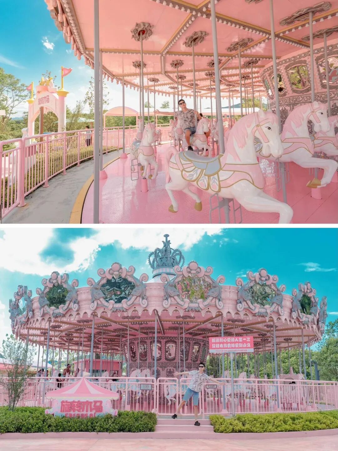 超出片的粉色旋转木马🎠,随手拍就是ins风,坠入童话的世界~九曲花径🌸,你牵着我,一起在动漫里的绣球花廊里,去追逐天空的云朵,好浪漫;白色的风车牧场~休闲和刺激的项目都很丰富
