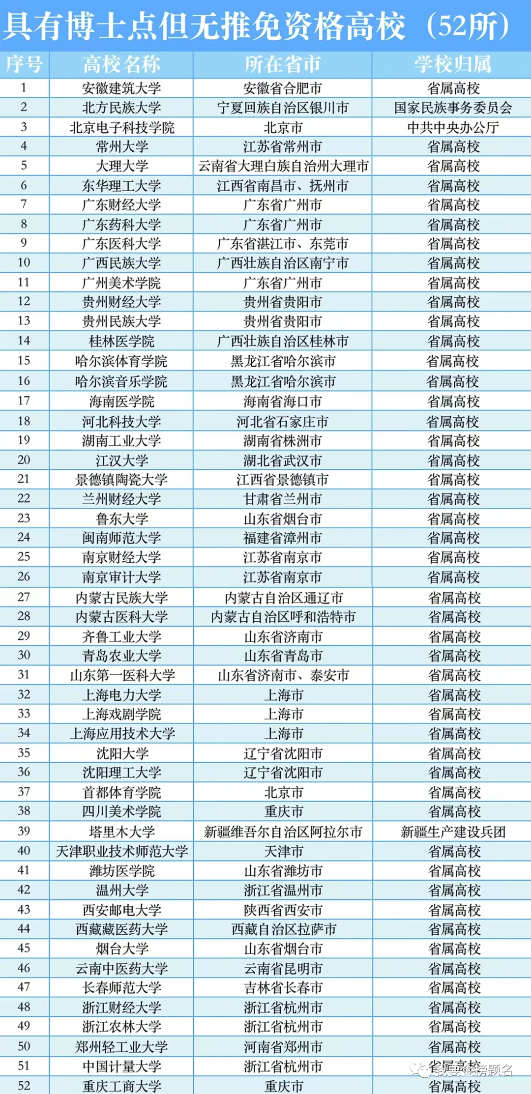 很多都是一本院校,也有保研资格,比如像湖南省的南华大学,湖南科技大学,湖南农业大学,高考的时候录取分数并不是太高。一般中等成绩的考生都能考入,这些学校拥有保研资格,很多都能保送进入名牌大学。大家可以多多关注一下。对于成绩比较差一点的考生,考不上拥有保研资格的学校,怎么办?不用怕,这里还有52所拥有博士学位,但没有保研资格的名校,可以重点关注一下这些学校,可能在下一次研究生推免权的增选中就会被纳入,所以考入这样的学校,也有可能在你的大学生涯中,学校就获得了研究生的推免权。