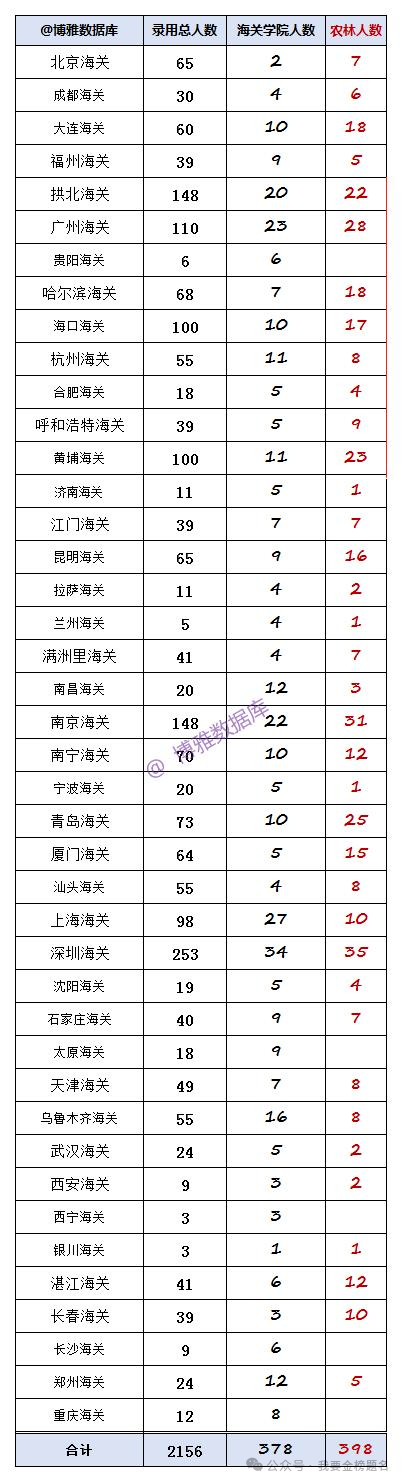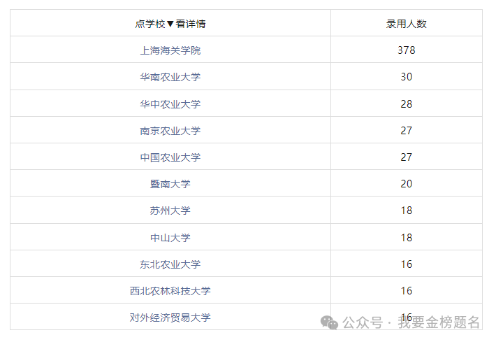我们再来看排名第二的是华南农业大学,招录了30人,第3名是华中农业大学,28人,第4名是南京农业大学和中国农业大学分别是27人。同时还有东北农业大学,西北农林大学都是16人。为什么有这么多农业大学的学生被招进了海关系统,这就不得不说另外一个问题。