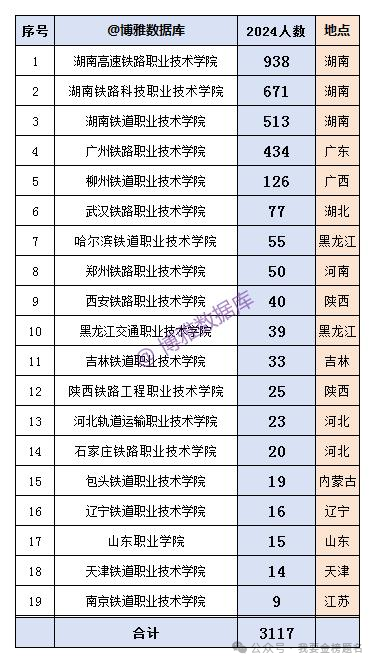 当然高职院校入职铁路系统有一个很大的特点,就是地域化,基本上就是分配在户籍所在地铁路公司,因为广铁集团管辖湖南省内铁路,所以湖南省的三所铁道类院校入职的学生是最多的,同时这三所学校原来也有铁道部背景。