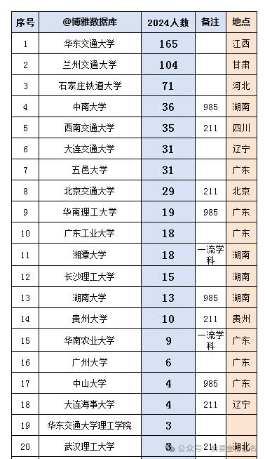 广铁集团发布了2024年校园招聘的录用名单,看看哪些学校录用人数最多,本科批招聘一共663人,其中本科学历534人,硕士研究生学历128人,博士研究生1人,录用人数最多的是华东交通大学165人,第2位是兰州交通大学104人,第3位是石家庄铁道大学71人,第4到第6位分别是中南大学,西南交通大学,大连交通大学,前6位的学校都是原铁道部下属院校,从这里我们就可以看出,铁道部下属院校入职铁路局比例是相当高的,这就是我们经常所说的行业内特色院校。