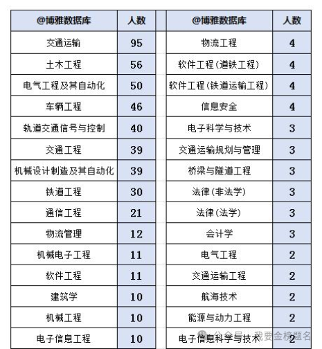 我们再来看一看哪些专业录取人数是最多的,排名第一的是交通运输95人,第2名的是土木工程56人,第3名是电气工程及自动化50人。第4到第6名分别是车辆工程、轨道交通信号与控制、交通工程,可以看出这些专业都是铁道类相关专业,甚至前10位的专业都是铁道类相关专业,而这些专业大部分都在原铁道部下属院校开设的最多,所以选对专业也是非常关键的,铁道系统分为车务段,机务段,工务段,供电段,信号段等各个部门,大部分都需要专业的技术人员,对经营管理人员需求量是比较少的,所以优先考虑工科类专业。