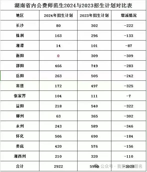 2024年湖南省乡村教师公费定向培养招生公告终于发布了,不好的消息是,今年的招生计划大大缩减了,跟去年相比减少了3000人。衡阳市更是一个人也没有招。这也算是破天荒的第一次。其中常德益阳,郴州,永州缩减人数都超过了300人。长沙岳阳邵阳减少了200人以上。具体招生人数看下表。