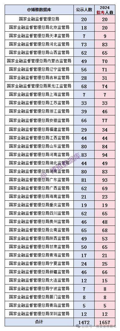 从首批公开的录用人数来看,国家金融监管总局河南监管局录用人数最多,一共是83人,其次是广东监管局81人,第三是湖南监管局80人。从学历层次上来看,本科生805人,硕士研究生663人,博士研究生4人,还是以本科生为主,硕士研究生占的比例也比较大,从性别比例来看,女生787人,男生685人。女生人数略多于男生。