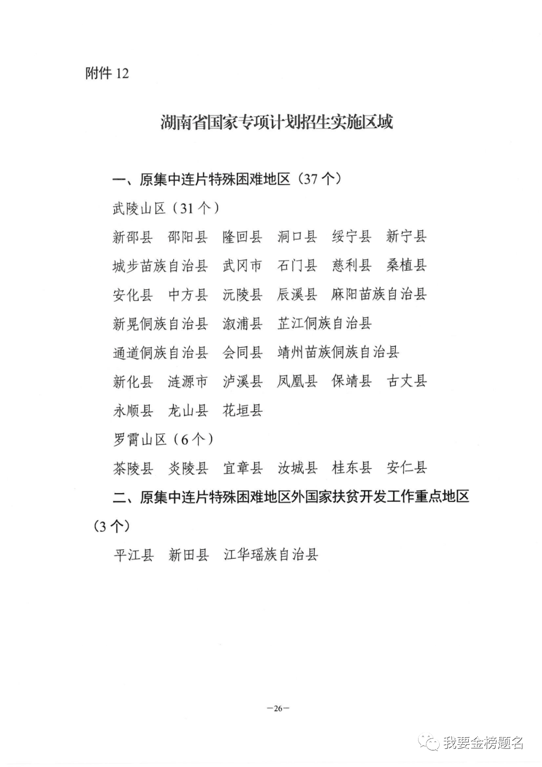 在这里我简单跟大家说一下,什么是专项计划?专项计划是国家为了照顾欠发达地区以及农村户籍考生单独列出的招生计划,一般在录取的时候,专项计划录取分数都比普通计划分数要低,有的甚至能低几十分。专项计划又分为国家专项计划,地方专项计划和高校专项计划。国家专项计划主要面向原国家贫困地区和集中连片困难地区学生。要求学生拥有当地三年以上学籍和户籍,父母或监护人也要拥有当地的户籍,城镇户口和农村户口都可报考,国家专项计划在湖南省共面向40个县市,主要是位于湘西地区。