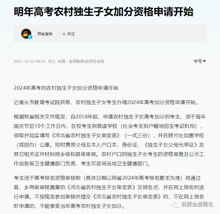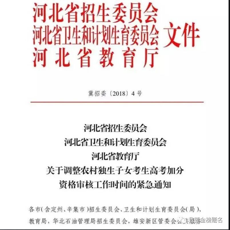 最近澎湃新闻报道,河北省的农村独生子女考生开始办理2024年高考加分资格申请。自2018年起。河北的农村独生子女考生,可以在国庆节后的10个工作日内,在所在就读的学校填写申请表。通过县乡两级审核,在网上进行申请。就可以获得高考加十分的资格。加分范围只适合于在河北省内招生的河北省属高校。但是新闻又提出2016年1月1号出生的农村户口独生子女,参加高考,不再享受加分政策。