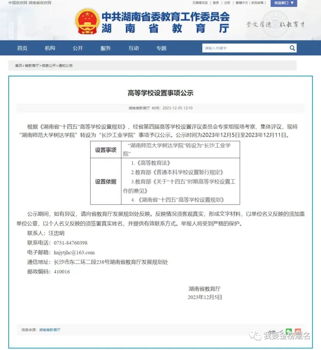 好消息啊,长沙市将新增一所本科院校。这就是长沙工业学院,今天湖南省教育厅发布公告,湖南师范大学树达学院将转设为长沙工业学院。据悉,这将是长沙市政府主管的一所公办院校。那么学校转设更名以后,会有什么变化呢?今天大华老师就跟大家来说一说。