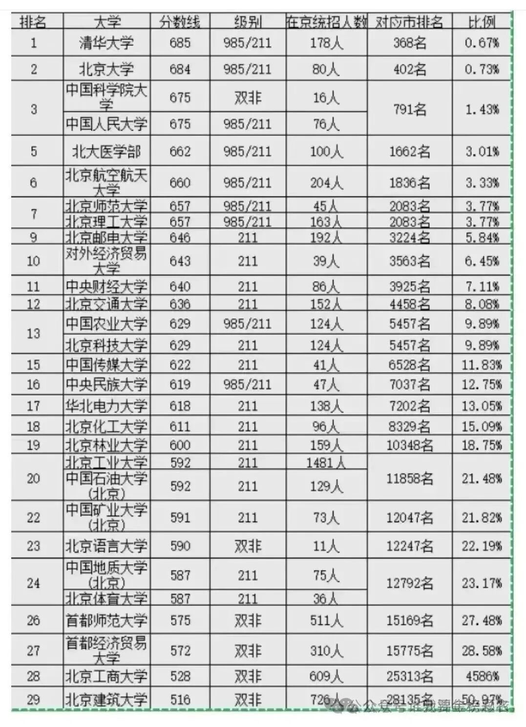 那么,对于想要考入北京地区985大学的学生来说,需要达到怎样的水平呢?以中央民族大学为例,其最低录取分数线为619分,排名需达到7037名,即北京市参加高考的同学中约有12.75%的学生能够考入这所985高校。虽然这一比例相较于清华北大有了显著的提升,但依然是竞争激烈的。但我们要考虑北京地区以外的985高校,可能录取分数比中央民族大学还要低,所以北京地区的学生考985的概率应该超过12%,相对于其他省份来说已经是算比较容易了。一般在高考大省,985高校的录取率不到1%。