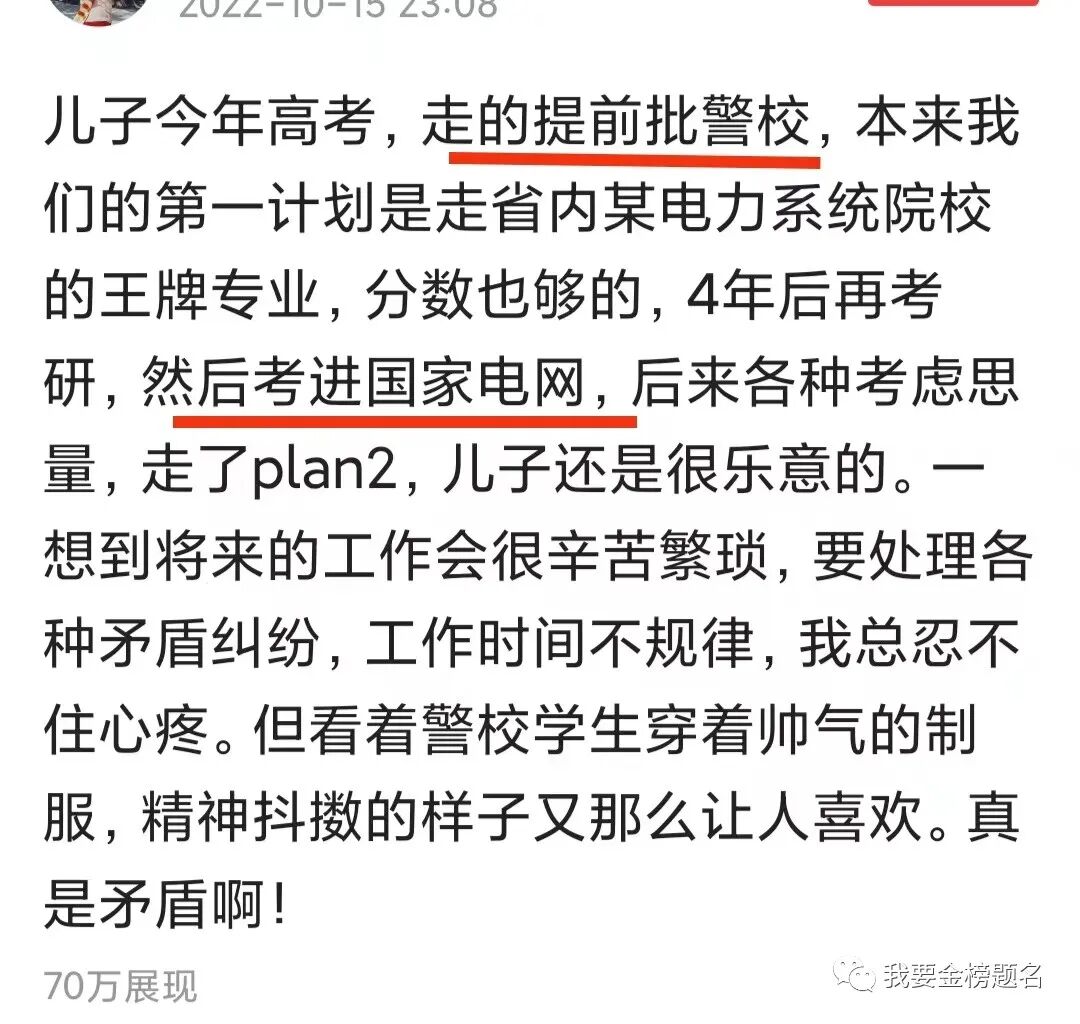 答疑:这确实是一个两难的选择,真的要根据自身的情况来看。第一,公安类院校提前批基本上就相当于铁饭碗,毕业以后95%以上能进公安系统做警察,但是电力系统院校进入国家电网的比例就没有那么高了,一个要学校是电力部原下属院校,另外还要求是电气工程及其自动化等电力相关专业,有的电网公司还对学历有要求,硕士生更受欢迎,所以,进国家电网竞争也更加激烈一些。第二,公安类院校是在提前批报考,国家电网是普通批,录取顺序一个在前,一个在后,所以不存在取舍问题,可以先报公安类院校,如果没有通过,再尝试普通批的国家电网类专业。第三,公安类院校录取分数并不是特别高。如果本身高考分数很高的话,比如男生达到600分的话,报省一级的公安院校可能有点吃亏,这个要想好。例如在湖南省,很多地市公安类专业500分就能录取,但是报考电力系统院校长沙理工大学电力相关专业,分数可能要到550分以上,高分考生就存在一个浪费分数的问题。近几年大学生就业偏紧,体制内工作更加受欢迎,读公安类专业是进入公务员队伍最好的方式之一,但是工作辛苦,任务重,有一定的危险性,这些问题报考前都要想好,选择无所谓对错,只有适合与否。欢迎大家留言,也欢迎大家把你的问题发给我,希望对您有所参考。