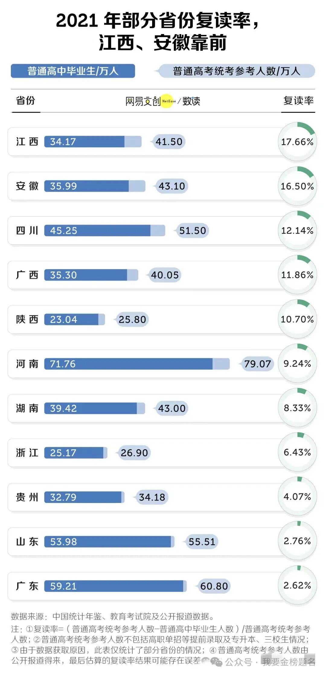 另外各省的复读生比例也不一样,可能一般人会认为河南省的复读生比例最多,实际上不是这样的,在总数上面河南省复读生人数最多,但是复读比例最高的却是中部的江西省,江西省2021年的复读率有17.6%,而河南省仅仅不到10%,一般复读比例高的都是高等教育资源比较匮乏的省份,例如江西省,安徽省,四川省,广西都是这样的情况,在这些高考大省,要想考一个重点本科,难上加难,很多人只有通过复读,才能进入更好的学校。