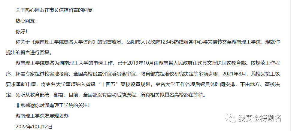 岳阳市人民政府将信件转交到湖南理工学院,学院发展规划办给予了详细的回答。主要内容如下,湖南理工学院更名为湖南理工大学的申请工作,已经于2019年10月由省人民政府正式报送国家教育部。按照规范流程,还需要专家进校实地考察,全国高校设置评议委员会审议,教育部党组会议研究决定等多个步骤。2021年学校又按上级的要求重新申请,将更名大学事项纳入省级十四五高校设置规划,更名大学工作各项后续具体的时间安排不是由地方高校决定的,必须听从教育部统一的部署,目前全国都没有启动后续的流程,所有相关拟更名高校都在等待。