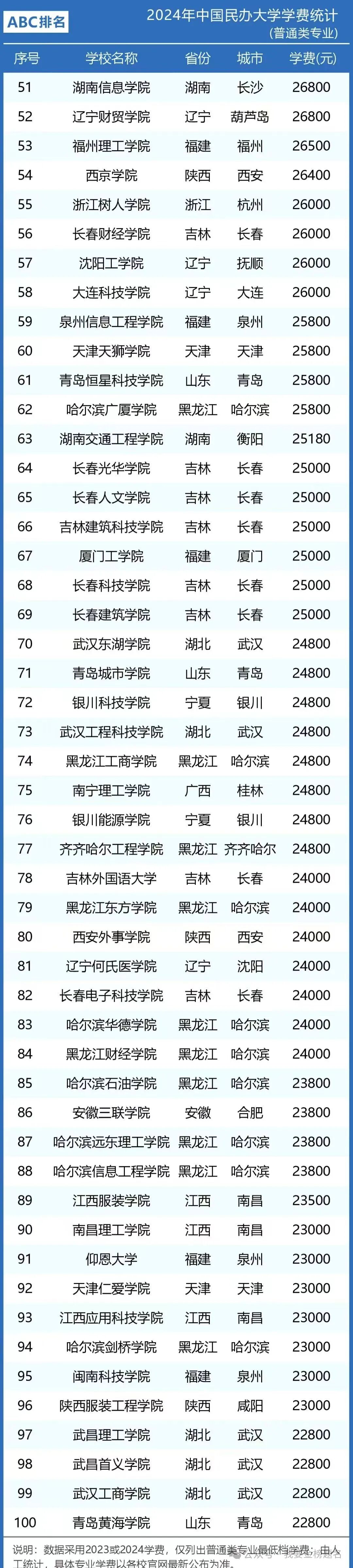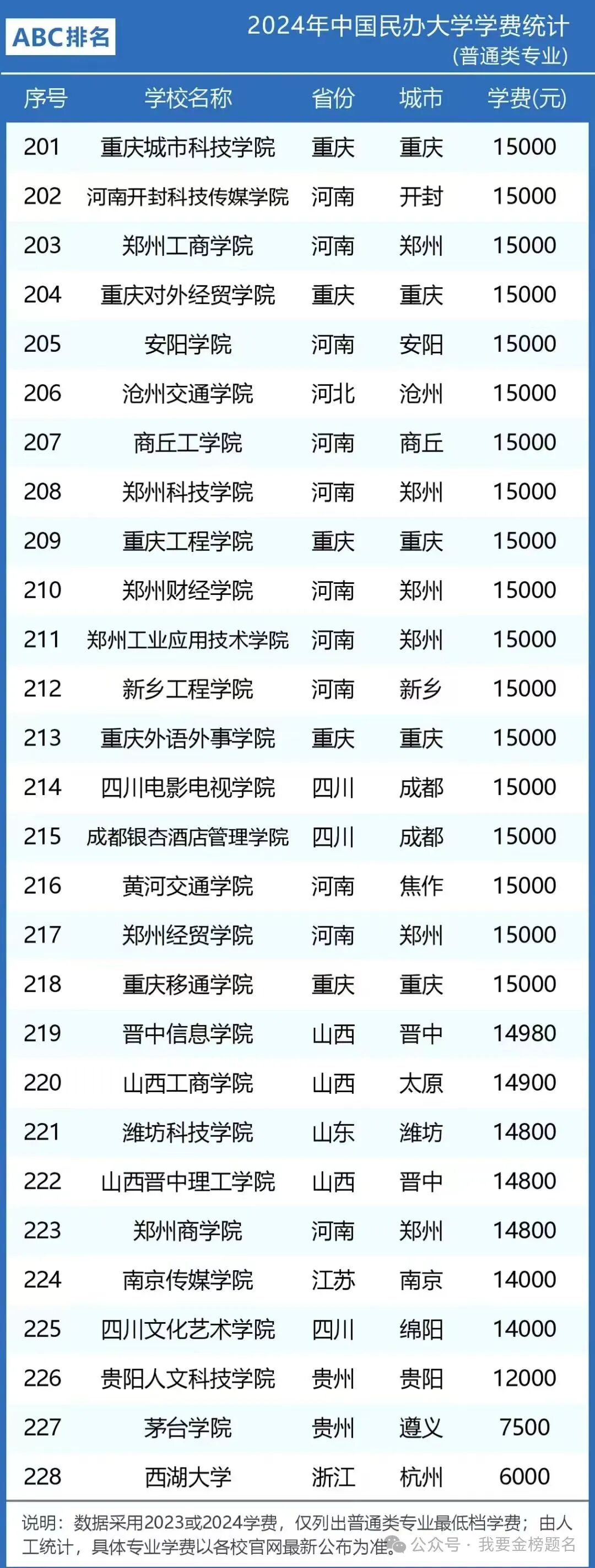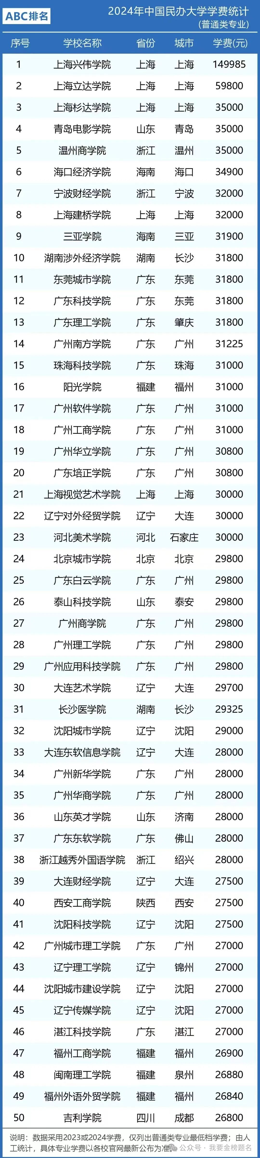 现在的民办大学数量越来越多,但是大家对民办大学吐槽最多的就是学费比较贵。读公办大学一年学费大概5000左右,但是现在的民办大学收费大多数都在1万以上,多的达到三四万一年。普通家庭真的很难承担,那么我国的民办大学收费情况到底是什么样的? Abc做了一个中国民办大学的排行榜,我们来看一下民办大学学费的排名情况。