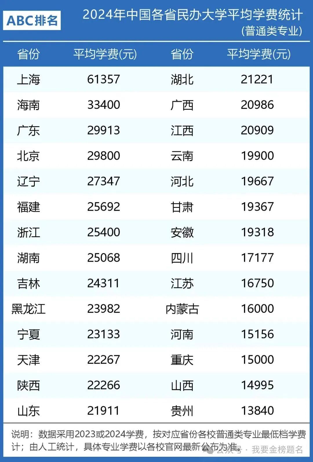 从各省的情况来看,民办大学的学费也呈现出一定的地域差异。上海市的民办大学平均学费最高,达到了61,357元。海南和广东分列第二和第三,平均学费分别为33,400元和29,913元。而学费最低的省份是贵州省,平均学费为13,840元,山西省则以14,995元的平均学费位列倒数第二。可以看出,经济发达地区的民办大学学费普遍较高,而欠发达地区的民办大学学费则相对较低。这与当地经济发展水平和家庭经济状况有着密切的关系。