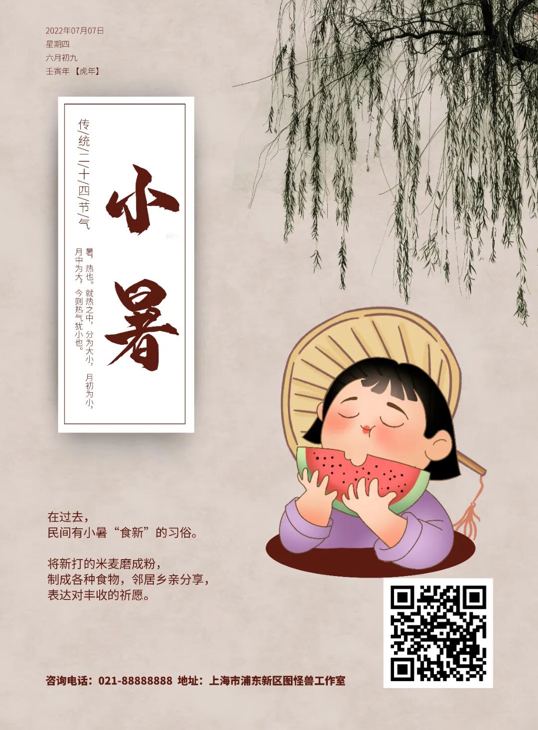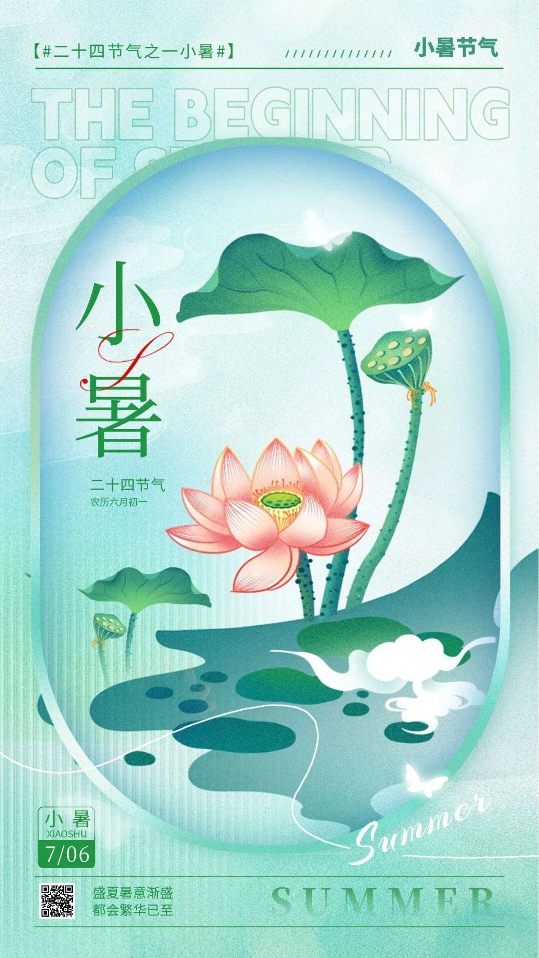 小暑,是二十四节气之第十一个节气,也是干支历午月的结束以及未月的起始。公历每年7月7日或8日太阳到达黄经105°时为小暑。民间有“小暑大暑,上蒸下煮”的说法,意味着小暑期间,炎热的天气正式开始。