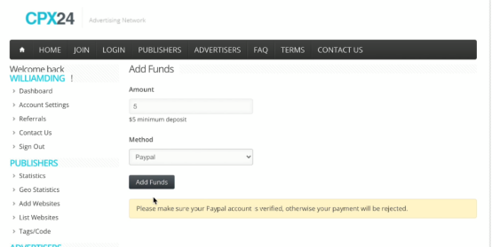 点击Add Funds,是充值界面,最低充值5美元,可以使用paypal付款