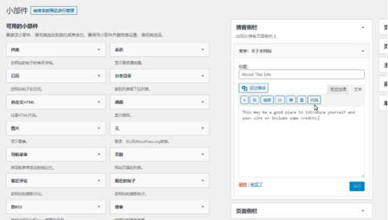 我们看到有个博客侧栏的选项,里面自带文字内容,你可以自行修改一下