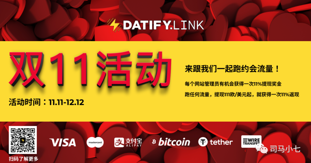 从11.11起到12.12 Datify.Link 举行个双11活动,每个网站管理员有机会获得一次11%提现奖金。