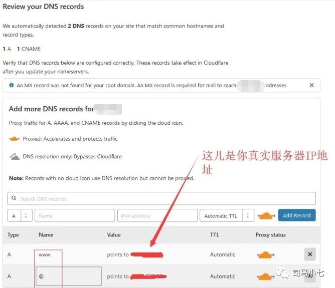 这里司马小七提醒注意一下:在cloudflare修改或者添加的DNS解析记录,对于网站来说,只需要添加两条A记录,分别是www、@的解析即可。添加@记录后,保存后显示的是你的域名。