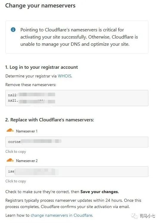 大家注意下,很多人卡在这个步骤不知道如何处理,其实很简单的,他的意思是需要你到域名注册商那儿修改nameservers,如果你是在namesilo注册的域名,就到namesilo后台修改,如果你是在godaddy注册的域名就到godaddy后台修改,同理,阿里云注册的域名,就去阿里云修改。